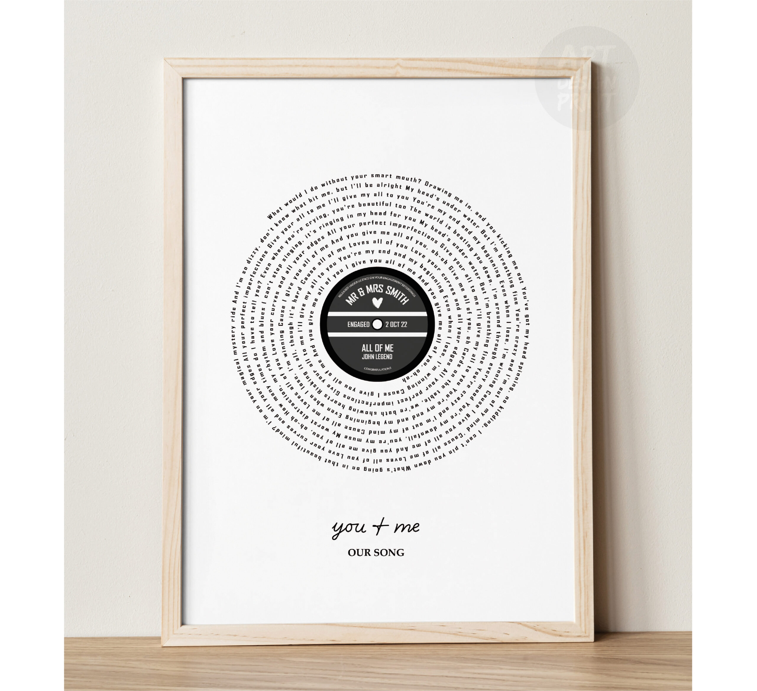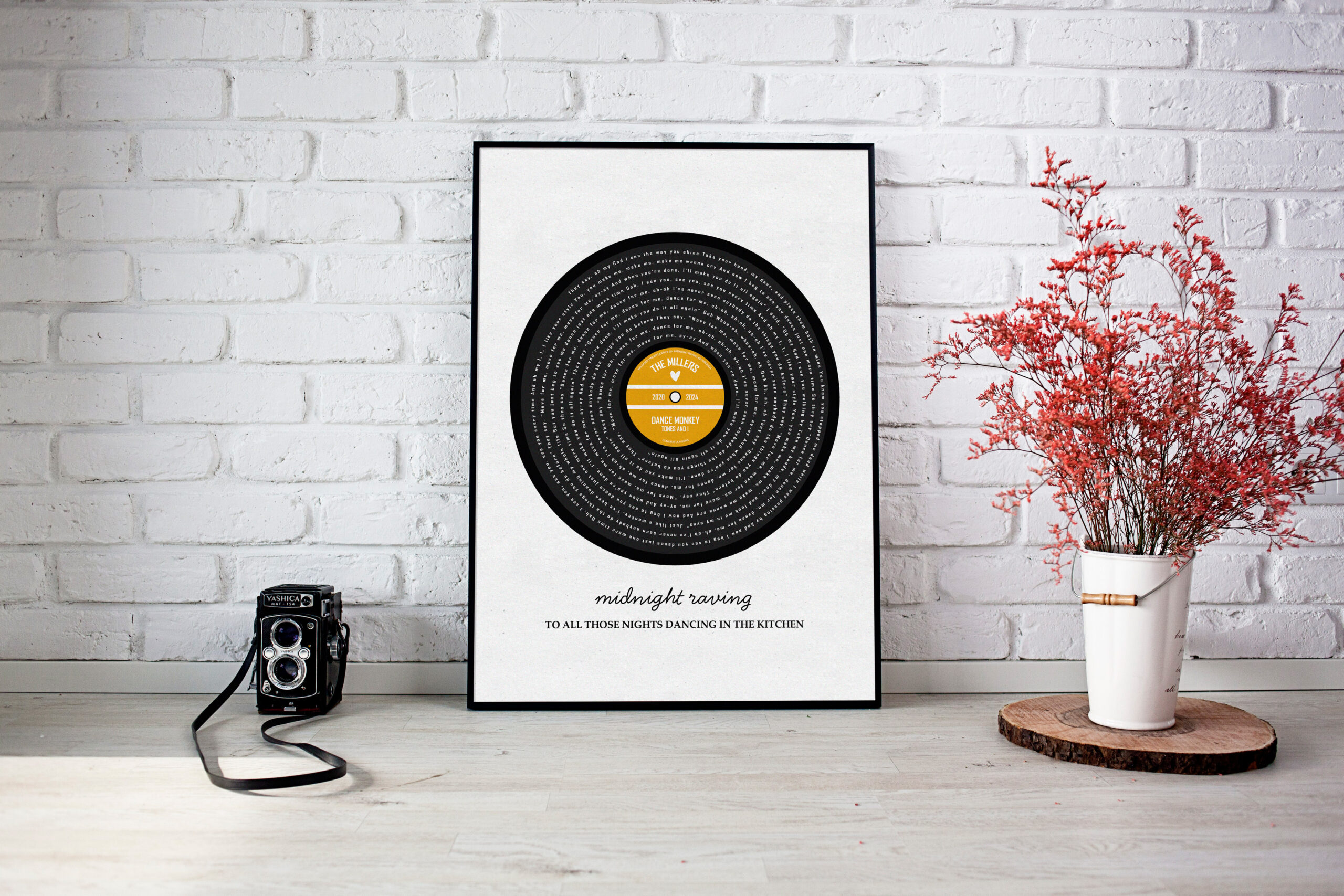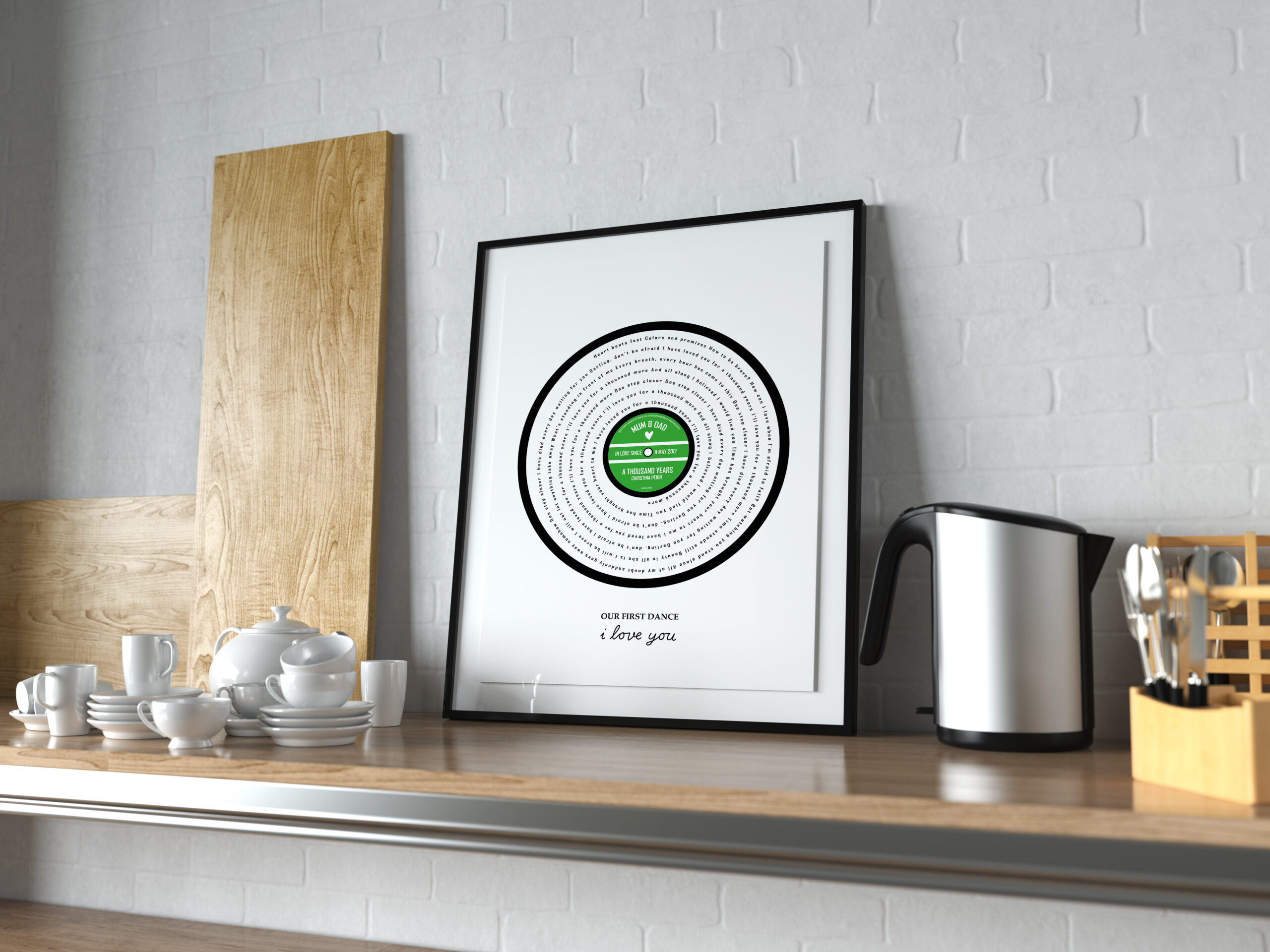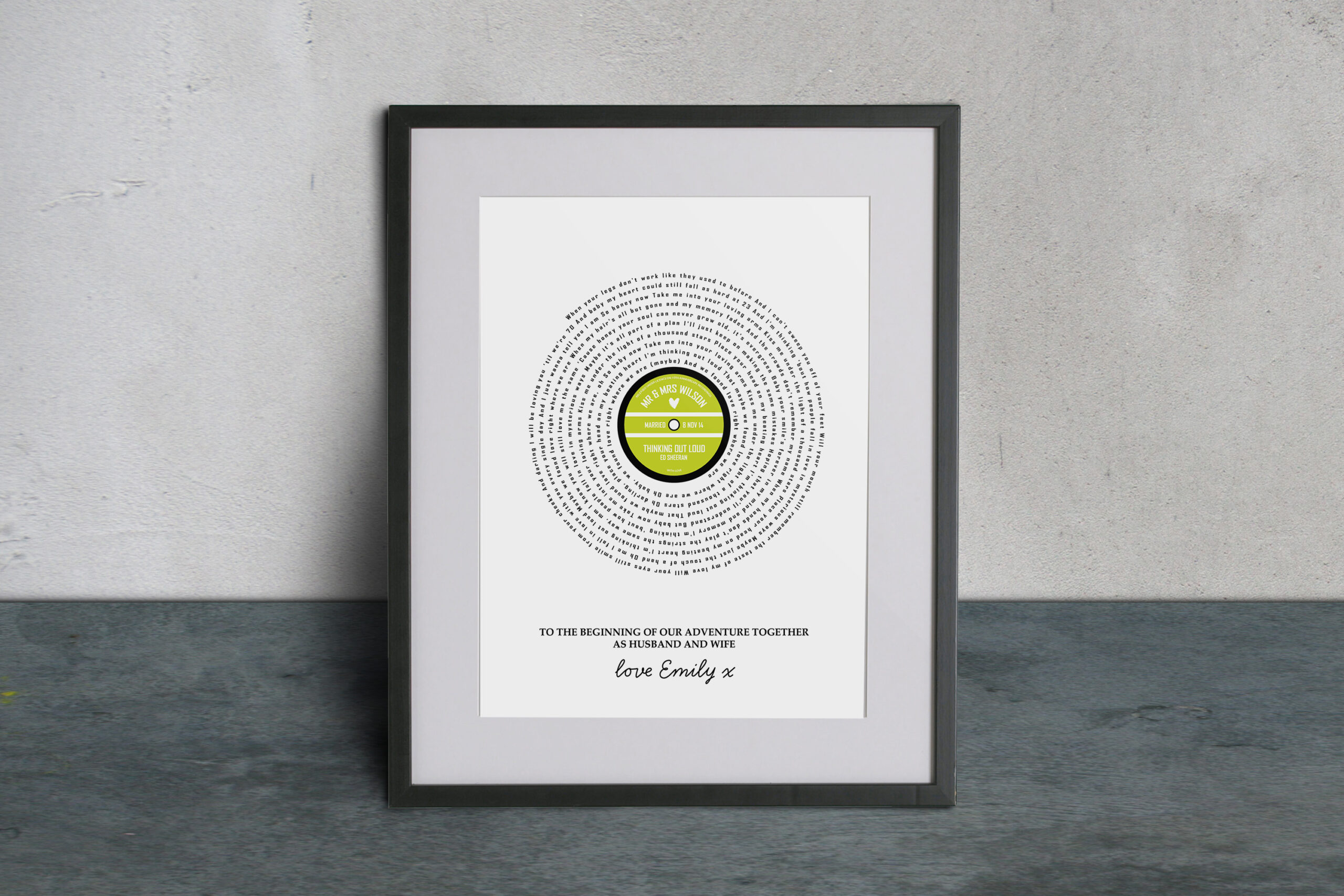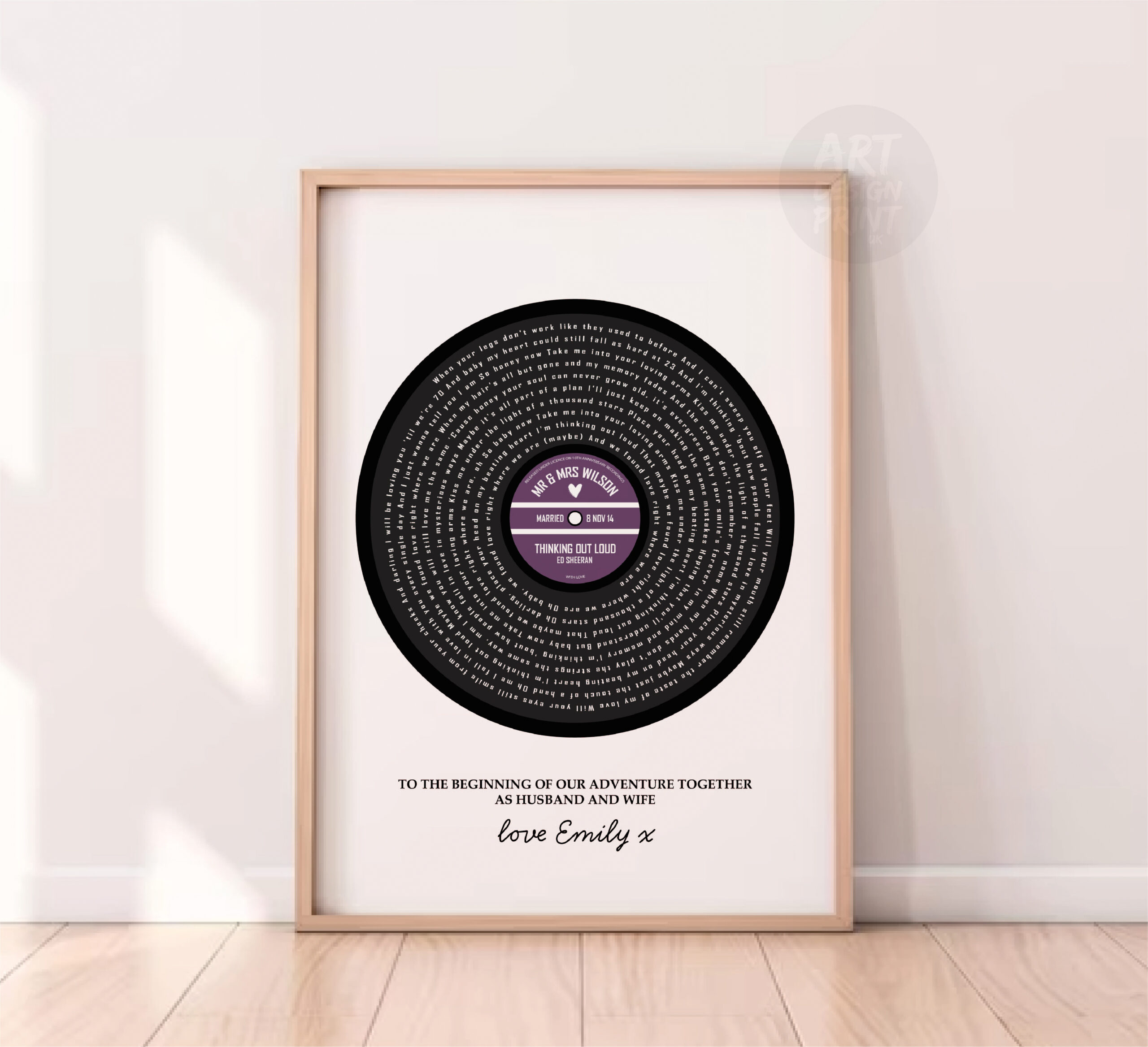 Get the perfect gift for your loved one with this custom song lyrics print that is personalised to celebrate your own special song in the style of a vinyl record.