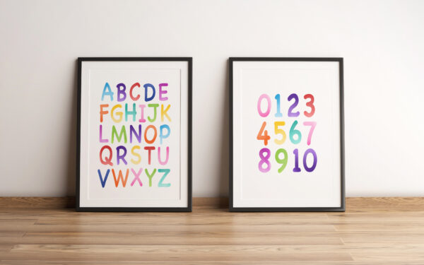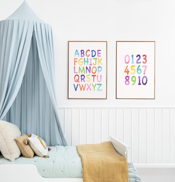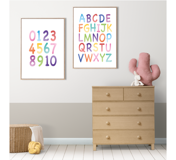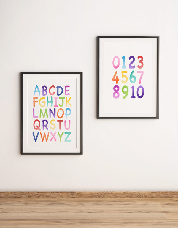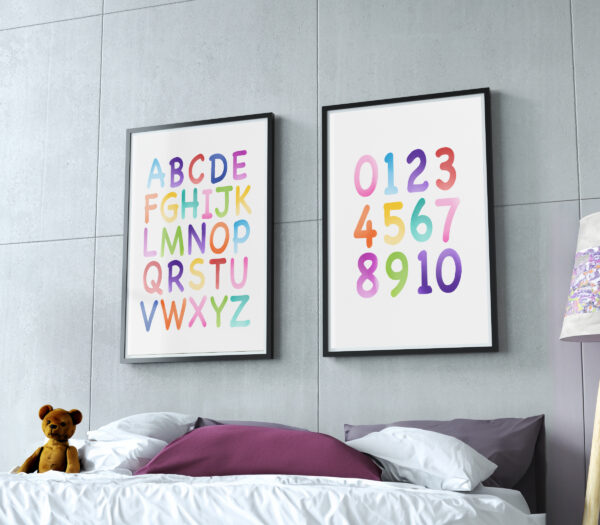 These bright, watercolour style posters will attract your children’s attention and look bright and playful as well as being educational for your little toddlers to learn their ABC and how to count from 0 to 10.